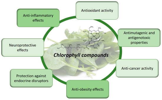 Chlorophylls play a crucial role in photosynthesis and are abundantly found in green fruits and vegetables that form an integral part of our diet. Although limited, existing studies suggest that these photosynthetic pigments and their derivatives possess therapeutic properties. These bioactive molecules exhibit a wide range of beneficial effects, including antioxidant, antimutagenic, antigenotoxic, anti-cancer, and anti-obesogenic activities. However, it is unfortunate that leafy materials and fruit peels often go to waste in the food supply chain, contributing to the prevailing issue of food waste in modern societies. Nevertheless, these overlooked materials contain valuable bioactive compounds, including chlorophylls, which offer significant health benefits. Consequently, exploring the potential of these discarded resources, such as utilizing them as functional food ingredients, aligns with the principles of a circular economy and presents exciting opportunities for exploitation.