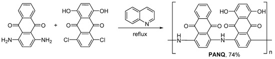PANQ was synthesized using a rather simple approach based on the reflux of a quinoline solution of 1,4-diaminoanthraquinone and 1,4-dichloro-5,8-dihydroxyanthraquinone in an inert argon atmosphere (