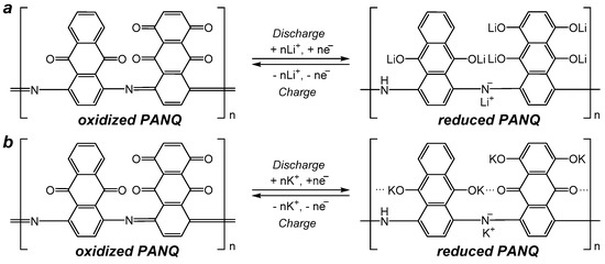 PANQ in the potassium cells compared to that of the lithium batteries discussed above is due to the bigger size of the potassium ion, which results in the steric hindrance of the reductive metalation of the neighboring carbonyl groups in this material (
