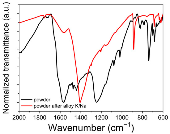 PANQ and the chemically metalated sample using a liquid K/Na alloy. The changes in the FTIR spectra (