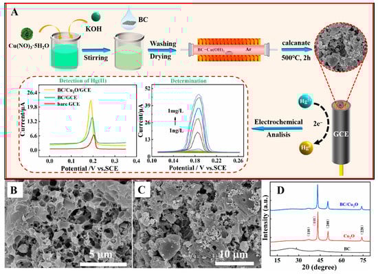 (A) Synthesis route of BC/Cu2O and its applications in Hg2+ detection; SEM images of (B) BC, (C) BC/Cu2O; and (D) XRD of BC, Cu2O, and BC/Cu2O composite.