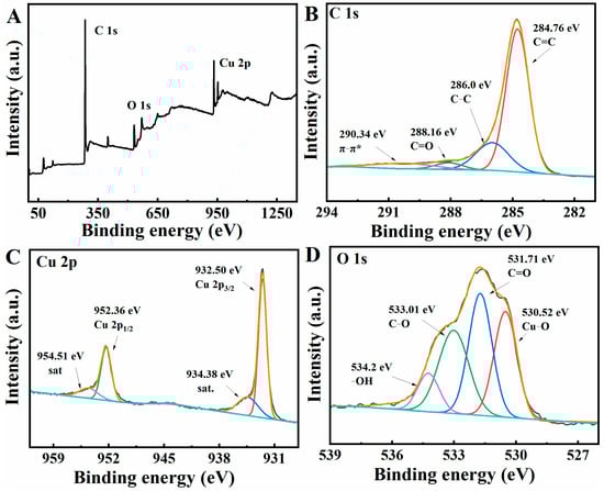 XPS diffraction patterns for BC/Cu2O: full scan (A), high-resolution C 1s spectrum (B), high-resolution Cu 2p spectrum (C), and high-resolution O 1s spectrum (D).