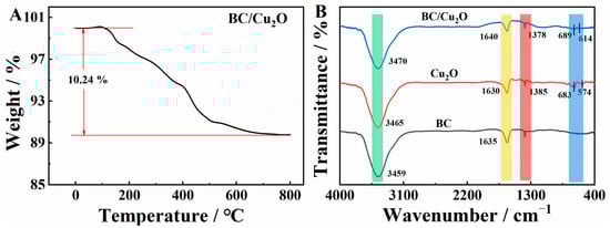 (A) TGA curve of the BC/Cu2O composite; (B) FT-IR spectra of BC, Cu2O, and BC/Cu2O.