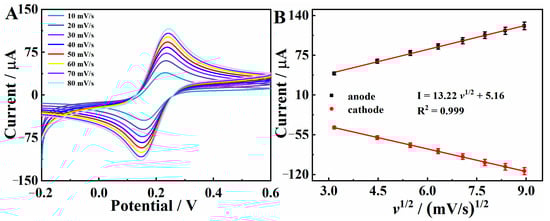 The CV plots for BC/Cu2O/GCE in a 5.0 mM [Fe(CN)6]3−/4− solution with 0.1 M KCl at scan rates ranging from 10 to 80 mV·s−1 are shown in Figure 4. The electrochemical surface area can be derived according to the Randles–Sevick equation [28]:
