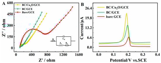 The inherent interfacial properties of bare GCE, BC/GCE, and BC/Cu2O/GCE were measured using EIS studies. Figure 5A shows the Nyquist plot of bare GCE, BC/GCE, and BC/Cu2O/GCE. As can be seen, there are clear semicircle curves in the EIS spectra of bare GCE, BC/GCE, and BC/Cu2O/GCE. The inset in Figure 4A shows the Randle equivalent circuit, which is composed of the Warburg constant (Zw), the resistance of the solution (Rs), electron-transfer resistance (Ret), and the double-layer capacitance (Cdl). For bare GCE, the Ret value was found to be 652.3 Ω. After modification with BC, the observed low Ret (58.13 Ω) value indicates the high electrical conductivity of BC. The modification of GCE with BC/Cu2O increased the electron-transfer resistance compared with BC/GCE, which is due to the low electrical conductivity of Cu2O.