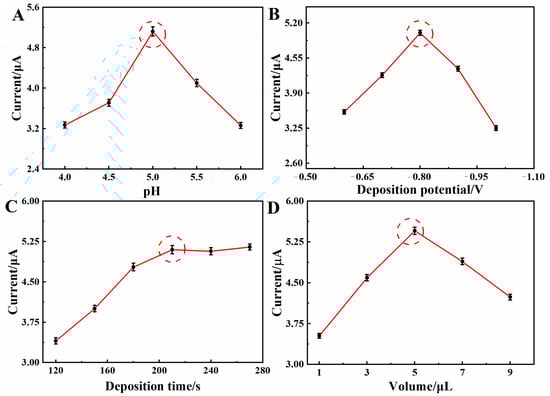 pH optimization was performed in the range of pH 4.0–6.0 in 0.1 mol·L−1 of ABS buffer (Figure 6A). The DPASV peak current of Hg2+ gradually increased from pH 4.0 to 5.0. At a low pH, the solution contained more hydrogen ions, which can compete with the heavy metal ions for the active site on the electrode surface. When the pH increased further, the anodic peak current decreased sharply due to the hydrolysis of the metal ions [29]. The peak current of Hg2+ dissolution reached its maximum at pH = 5.0. So, a pH of 5.0 was used for the next stripping determinations.