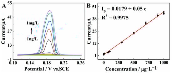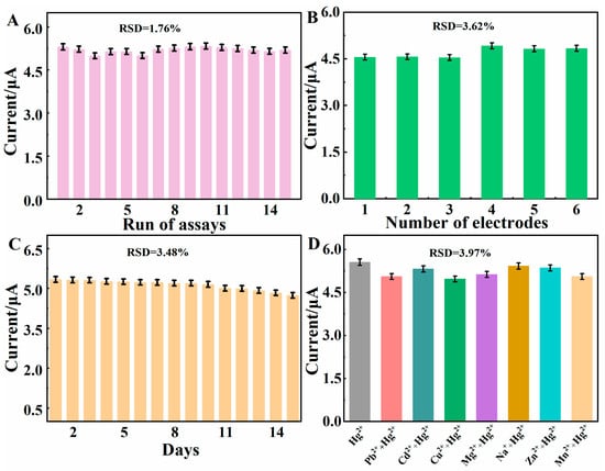 The effect of deposition potential on Hg2+ signals was investigated in the potential range from −0.6 V to −1.0 V (Figure 6C). The peak current of Hg2+ increased significantly at first and then gradually decreased with a negative shift of the deposition potential. When the deposition potential is too negative, the hydrogen evolution reaction could destroy the metal ions deposited on the electrode surface, resulting in a decrease in the dissolution peak current [30]. In addition, the more positive the deposition potential is, the more difficult it is for the reduction reaction of Hg2+ to occur, reducing the accumulation of Hg0 on the electrode surface. The maximum response current of Hg2+ was observed at a deposition potential of −0.8 V. Therefore, −0.8 V was established as the optimum deposition potential for Hg2+ detection.