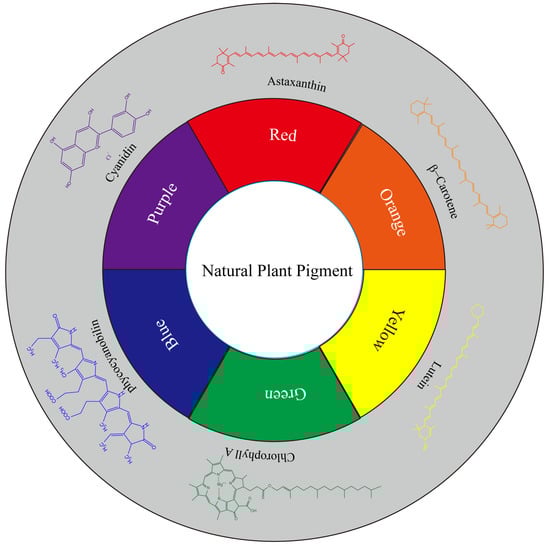 Representative natural plant pigments of different colors: Astaxanthin, β-carrot, Lutein, Chlorophyll A, Phycocyanobilin, and Cyanidin.