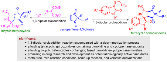N-2,2,2-trifluoroethylisatin ketimines are one class of active azomethine-ylide precursors that are readily prepared from isatins and trifluoroethylamine by condensation reaction [39]. In recent years, a wide variety of 1,3-dipolar cycloadditions have been developed by using N-2,2,2-trifluoroethylisatin ketimines reacted with various dipolarophiles to synthesize CF3-containing spirocyclic oxindoles bearing multiple stereogenic centers [40,41]. As a continuation of our research interest in 1,3-dipolar cycloaddition for synthesis of polyheterocycles [42,43,44], we envisaged that a series of highly functional polyheterocycles fused by CF3-containing spirocyclic oxindole, pyrrolidine, and cyclopentane substructures could be assembled via the formal 1,3-dipolar cycloaddition reaction of N-2,2,2-trifluoroethylisatin ketimines and cyclopentene-1,3-diones under suitable conditions, and that this reaction would be capable of causing the desymmetrization transformation of cyclopentene-1,3-diones. (Scheme 1). Furthermore, we found that the 1,3-dipolar cycloaddition of trifluoromethyl-substituted iminomalonate and cyclopentene-1,3-diones is feasible through a desymmetrization process, leading to the formation of bicyclic heterocycles containing fused pyrrolidine-cyclopentane moieties (Scheme 1). The resulting novel tetracyclic spirooxindoles and bicyclic heterocycles were characterized by melting point, NMR, and HRMS. Herein, we report our latest results on this subject.