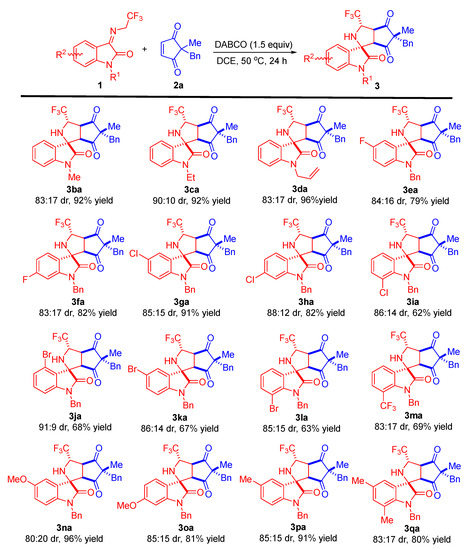 Initially, we selected the N-2,2,2-trifluoroethylisatin ketimine 1a and cyclopentene-1,3-dione 2a as model substrates for the optimization of reaction conditions. As shown in Table 1, to our delight, when using 1,1,3,3-tetramethylguanidine (TMG) as the base the reaction could proceed well in 1,2-dicholorethane (DCE) at 30 °C, providing the tetracyclic spirooxindole containing pyrrolidine and cyclopentane subunits 3aa in 73% yield with 81:19 dr (Table 1, entry 1). By screening different organic bases (Table 1, entry 2–4) such as 1,8-diazabicyclo[5.4.0]undec-7-ene (DBU), 1,5-diazabicyclo[4.3.0]non-5-ene (DBN), and 1,5,7-triazabicyclo[4.4.0]dec-5-ene (TBD), we found that DBU was the best candidate and that the corresponding cycloaddition product 3aa could be obtained in 87% yield with good diastereoselectivity (Table 1, entry 2). In the presence of the inorganic base CS2CO3, the reaction took place but yielded the cycloaddition product 3aa with poor results (only 30% yield and 71:29 dr) after 96 h (Table 1, entry 5). Next, different solvents, including toluene, THF, MeCN, and MeOH, were investigated, and it was found that DCE was the optimal solvent in terms of yield and diastereoselectivity (Table 1, entry 2 vs. entries 6–10). We were pleased to find that changing the base from DBU to 1,4-diazabicyclo[2.2.2]octane (DABCO) in DCE could lead to better results (90% yield and 84:16 dr), despite increasing the reaction time to 48 h (Table 1, entry 12). Raising the reaction temperature to 50 °C delivered product 3aa in 90% yield and 84:16 dr with a reduction of the reaction time to 24 h (Table 1, entry 13). By altering the ratio of substrates 1a:2a from 1.2:1 to 1.5:1, the isolated yield of product 3aa could be slightly improved to 92% (Table 1, entry 14). Finally, the product 3aa was obtained in 96% yield with 85:15 dr at 50 °C for 24 h by increasing the amount of DABCO from 1.0 equivalent to 1.5 equivalents (Table 1, entry 15).