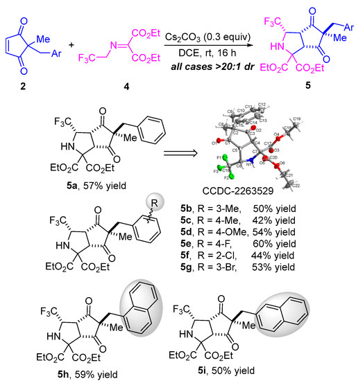 Having established the general scope of the metal-free diastereoselective formal 1,3-dipolar cycloaddition of N-2,2,2-trifluoroethylisatin ketimines 1 and diverse cyclopentene-1,3-diones 2, we next attempted the formal 1,3-dipolar cycloaddition of trifluoromethyl-substituted iminomalonate 4 and cyclopentenediones 2 through a desymmetrization strategy. As illustrated in Scheme 3, using Cs2CO3 as a catalyst in DCE at room temperature for 16 h, the reaction of 2-benzyl-2-methylcyclopentenedione 2a and trifluoromethyl-substituted iminomalonate 4 proceeded well, providing the desired bicyclic heterocyclic product 5a in 57% yield with >20:1 dr. The generality of this transformation of various cyclopentene-1,3-diones 2 and trifluoromethyl-substituted iminomalonate 4 was then investigated, and it was found that all reactions resulted in the corresponding cyclization products with excellent diastereoselectivities (all cases > 20:1 dr) (Scheme 3). As cyclopentenediones bearing different electron-donating substituents such as methyl and methoxyl on the phenyl, these substrates worked well in the reaction with trifluoromethyl-substituted iminomalonate 4 under the standard conditions, providing the desired cycloaddition products 5b–d in moderate yields (42–54% yield). Likewise, cyclopentenediones with various electron-withdrawing substituents (F-, Cl, and Br-) on the phenyl ring, regardless of the position, were compatible with the catalytic system in the reaction with 4, affording the desired cycloaddition products 5e–g in yields ranging from 44–60%. Cyclopentenedione substrates bearing a sterically hindered naphthyl group proceeded successfully as well, yielding the corresponding bicyclic heterocycle products 5h and 5i in 59% and 50% yield, respectively. The structure and the relative configuration of product 5a was unambiguously determined by single-crystal X-ray analysis, and the configurations of all other products in Scheme 3 were assigned by analogy due to their formation through a common reaction pathway [45].