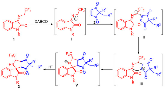 Based on our experimental results and previous related reports [30,31,32,33], a plausible catalytic mechanism involving a stepwise reaction process was assumed to explain the stereoselectivity of the 1,3-dipolar cycloaddition of N-2,2,2-trifluoroethylisatin ketimines and cyclopentene-1,3-diones. As depicted in Scheme 5, the N-2,2,2-trifluoroethylisatin ketimine 1 is deprotonated under a basic condition to yield the 2-azaallyl anion intermediate I. As illustrated in transition state II, the α-carbon anion of intermediate I approaches the carbon–carbon double bond of cyclopentene-1,3-diones, resulting in addition of the intermediate III. Subsequently, intramolecular cyclization from the carbon anion to the C=N of azomethine-ylide occurs, delivering the intermediate IV, which is protonated to form products 3.