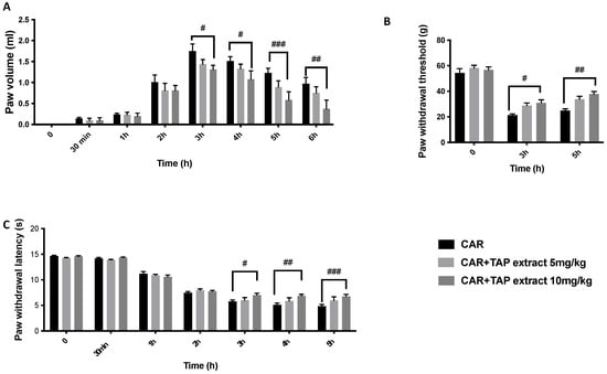 Evaluation of the effects of TAP extract on CAR-induced inflammation and pain. Paw volume (A); Von Frey test (B); and plantar test (C). Data are expressed as the means ± SEM of six animals from each group. # p < 0.05 vs. CAR; ## p < 0.01 vs. CAR; and ### p < 0.001 vs. CAR.