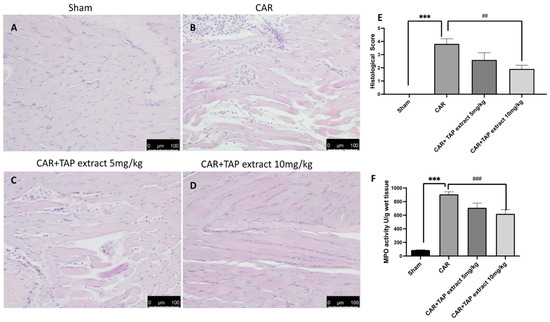 Histological evaluation of paw tissue. H/E staining was used to examine the tissue damage inflicted on the animals receiving CAR. Sham group (A), CAR group (B), and TAP extracts at the doses of 5 mg/kg and 10 mg/kg (C,D). Histological score (E). MPO analysis (F). Figures are representative of at least three independent experiments. Values are the means ± SEM of six animals from each group. Scale bar: 100 μm. *** p < 0.001 vs. sham; ## p < 0.01 vs. CAR; and ### p <0.001 vs. CAR.