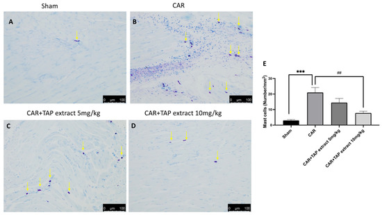 Histological evaluation of mast cell activity in paw tissue. Toluidine blue staining was used to examine the mast cell (yellow arrows) activation on the animals receiving CAR. Sham group (A), CAR group (B), and TAP extracts at the doses of 5 mg/kg (C) and 10 mg/kg (D). Mast cell count (E). Figures are representative of at least three independent experiments. Values are the means ± SEM of six animals from each group. Scale bar: 100 μm. *** p < 0.001 vs. sham; ## p < 0.01 vs. CAR.