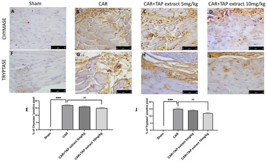 Via immunohistochemical analysis, we assessed the expression of chymase and tryptase, which are the markers of mast cell activation and degranulation. CAR injection significantly increased the positive staining for tryptase and chymase (Figure 4B,G) when compared with the Sham group (Figure 4A,F). The oral administrations of TAP extract at 10 mg/kg significantly decreased the expression of chymase and tryptase (Figure 4D,I).