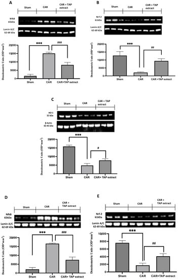 To better investigate whether TAP extract may act by interacting with signaling pathways such as nuclear NF-κB or Nrf-2/HO-1, Western blots for the NF-κB and NRF-2/HO-1 (Figure 5A–C expression in paw, Figure 5D–F expression in spinal cord) pathways were also performed in paw and spinal cord tissues. Increased nuclear NF-κB and reduced Nrf-2 expression were observed with respect to the sham animals. TAP extract significantly reduced the level of nuclear NF-κB, as well as up-regulated Nrf-2 when compared with the CAR group in both tissues. At the same time, Western blot analysis showed that TAP extract treatment at the dose of 10 mg/kg significantly enhanced a decrease in HO-1 protein expression in both tissues.