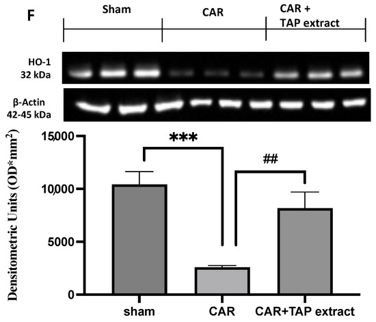 Western blot analysis in paw tissues and spinal cords. Western blot analysis for NF-κB paw expression (A), NF-κB spinal cord expression (D), Nrf-2 paw expression (B), NRF-2 spinal cord expression (E), HO-1 paw expression (C), HO-1 spinal cord expression (F), and TAP extract at a dose of 10 mg/kg. Values are the means ± SEM of six animals from each group. A demonstrative blot of lysates with a densitometric analysis for all animals is shown. # p < 0.05 vs. CAR; ## p < 0.01 vs. CAR; and ### p <0.001 vs. CAR. *** p < 0.001 vs. sham.