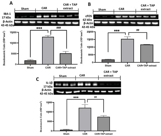 As indicated above, spinal-activated microglia can generate IL-1β production, which is a pro-inflammatory cytokine that can trigger inflammatory cascades and modify the function of neighboring cells such as neurons, thus resulting in altered nociceptive processing. To examine the involvement of spinal microglia in this CAR model, the expression of Iba-1 (Figure 6A) in the spinal cord was quantified by Western blot. Compared with the expression level of Iba-1 in the sham animals, the expression level of Iba-1 in the CAR-injected rats was found to be significantly increased. Spinal Iba-1 and the expression of IL-1β (Figure 6C) were both up-regulated during CAR-induced inflammation. Due to the creation of edema and the existence of the inflammatory state, pain is an ever-present aspect; for this reason, we also measured changes in spinal c-Fos expression as a marker of neuronal activity (Figure 6B). The oral treatment of TAP extract at a dose of 10 mg/kg was able to modulate the expression of Iba-1 and Il-1β, as well as suppressed spinal c-Fos expression.