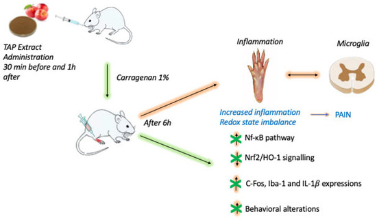 Inflammation research has been a major focus of global scientific inquiry. Inflammation is recognized as being associated with oxidative processes, owing to the fact that they share certain similar pathways. As oxidative stress and inflammation are widespread in many degenerative diseases, dietary antioxidants may illuminate a significant protective impact. TAP extract is abundant in antioxidants, polyphenols, and other compounds that have been shown to be active. In conclusion, we demonstrated that orally administering TAP extract at a concentration of 10 mg/Kg was effective in considerably counteracting CAR-induced paw tissue damage and the resulting inflammatory pain (Figure 7).