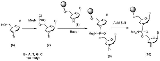PMOs are currently synthesized with phosphoramidate P(V) chemistry on a solid support using chlorophosphoramidate building blocks, as described in Scheme 1. The first step is condensing a 6′-hydroxyl-N-tritylmorpholino nucleoside 6 with N,N-dimethylaminodichlorophosphoramidate in order to generate an N,N-dimethylamino chlorophosphoramidate synthon 7. Coupling the base of this synthon to a morpholino nucleoside linked to a support through the 6′-hydroxyl 8 generates the dimer 9 attached to the resin. Further detritylation with an acid salt yields a product 10 that can be elongated by repeating the cycle [7]. Several limitations of this synthesis approach have been reported [8]. PMOs are synthesized in a 5′ to 3′ direction, whereas almost all other oligonucleotide synthesis chemistries take place in a 3′ to 5′ direction [9]. Thus, the synthesis strategy for PMOs is not compatible with most other chemistries, which severely limits the ability to synthesize chimeras having PMOs and other analogues. Additionally, the active chlorophosphoramidate synthon is a P(V) compound which is less reactive and therefore leads to significantly lower yields than the P(III) oligonucleotide synthesis strategy.