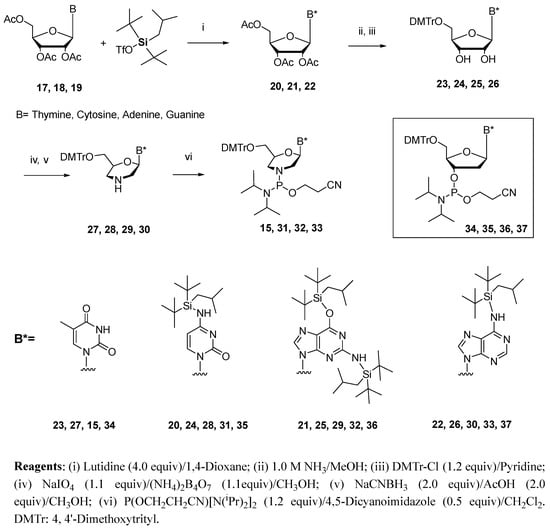 The preparations of these four building blocks, as outlined in Scheme 3, were based upon modifications of the originally published procedures [16,17]. 5′-O-Dimethoxytrityl ribothymidine 23 was treated with sodium periodate and then ammonium biborate to afford the dihydroxythymine morpholino monomer. Reduction using sodium cyanoborohydride under mild acidic conditions yields the thymine morpholino monomer 27 [17]. The morpholino–thymine synthon 15 was then prepared in an 86% yield via the phosphitylation of 27 with 2-cyanoethyl-N,N,N′,N′-tetraisopropylphosphordiamidite and 4,5-dicyanoimidazole (DCI) in dichloromethane under an argon atmosphere [12]. Synthesis of the cytosine, adenine, and guanine monomers began by first protecting the nucleoside amino groups with BIBS. The reaction of 5′,3′,2′-tri-O-acetylcytidine 17 with BIBS-OTf (Tf = triflate) in the presence of 2,6-lutidine gave a 76% yield of 20 after 2 h of stirring at 60 °C under argon. The synthesis of 21 and 22 from 18 and 19, respectively, required much longer reaction times (3 days), with yields of 25−31% and 74%. These silylated ribonucleosides were then treated with ammonium hydroxide to remove the acetyl protecting groups, converted them to the 5′-dimethoxytrityl compounds and then to the morpholino derivatives (28, 29, and 30) using the same chemistry as outlined for the preparation of 27. These compounds were used to generate the phosphorodiamidite building blocks 31, 32, and 33. For the synthesis of PMO−DNA chimeras, 5′-O-(4,4′-dimethoxytrityl)-2′-deoxyribonucleoside-3′-phosphoramidite building blocks 35, 36, and 37 were prepared following a literature protocol [14,15], whereas compound 34 was obtained from commercially available sources.