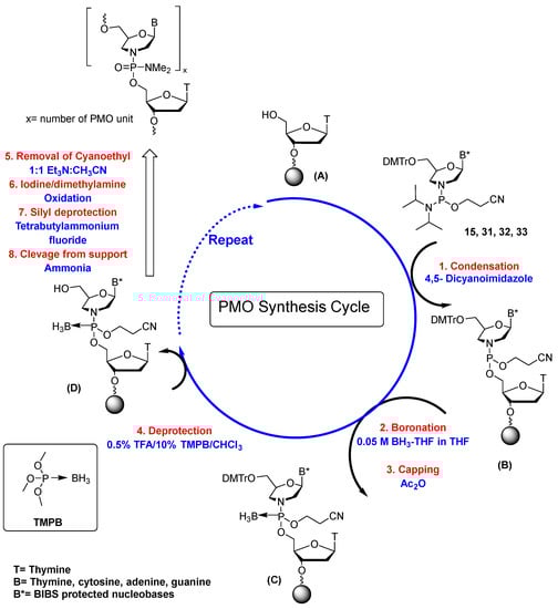 Because of the versatility of P(III) chemistry, several DNA/RNA derivatives in addition to natural DNA and RNA can be synthesized efficiently [10]. Thus, to develop an orthogonal synthetic approach for PMOs, we have explored the use of P(III) chemistry for preparing the PMO analogue and its derivatives on a solid support. If successful, a P(III) strategy would lead to procedures for preparing many oligonucleotide derivatives. In this short review, we will discuss the synthesis of PMOs and additional PMO-type analogues (MOs and TMOs, Figure 1) using phosphoramidite P(III) chemistry. Also, the biological properties of the newly developed TMOs will be discussed.