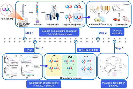 In light of this, our study aimed to isolate and identify the main degradation products of nardosinone after being refluxed in boiling water by combining several modern chromatographic separations with extensive spectroscopic analyses. Moreover, we attempted to profile the plausible degradation pattern of nardosinone by means of ultra-high performance liquid chromatography-photo-diode array (UPLC–PDA) and ultra-high performance liquid chromatography-diode array detector-quadrupole time-of-flight mass spectrometry (UHPLC–DAD/Q–TOF MS). The overall goal was to provide guidance and scientific evidence for future studies on the quality control and reasonable application of nardosinone-related products. The workflow of the entire study is presented in Figure 1.