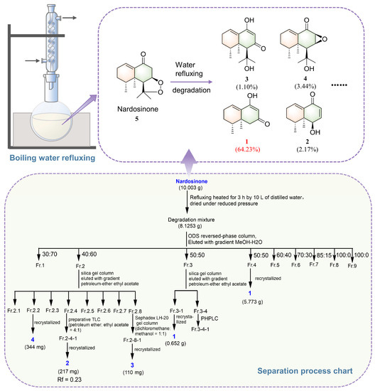 Separation process of the main degradation products of nardosinone in refluxing boiling water.
