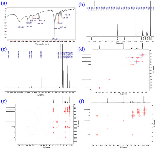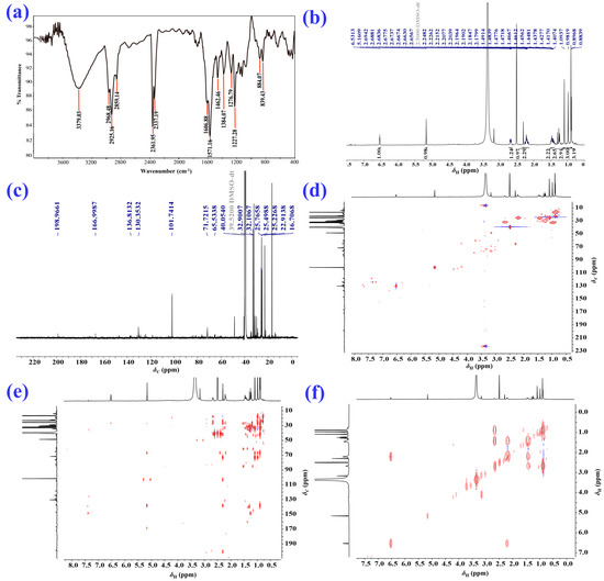 Spectrograms of 2–deoxokanshone L (3). (a) IR; (b) 1H NMR (600 MHz, DMSO–d6); (c) 13C NMR (150 MHz, DMSO–d6); (d) HSQC; (e) HMBC; (f) 1H–1H COSY.