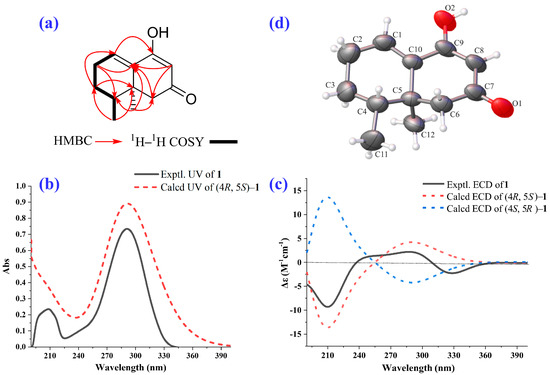 Structural identification of 2–deoxokanshone M (1). (a) Key HMBC and 1H–1H COSY correlations; calculated and experimental UV (b) and ECD (c) spectra; (d) ORTEP drawing established by the analysis of the single crystal X–ray diffraction data of compound 1.