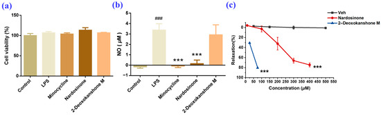 Anti-neuroinflammatory and vasodilatory activities of nardosinone and 2–deoxokanshone M. Effects on the cell viability (a) and production of NO in LPS–induced BV–2 cells (b) (### p < 0.001 vs. control group, *** p < 0.001 vs. LPS group, n = 5); (c) dose-vasorelaxant activity (*** p < 0.001 vs. Veh., n = 3).