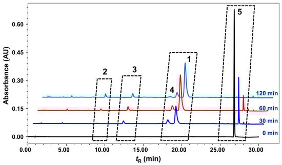 Stacked UPLC chromatograms of refluxed products of nardosinone in boiling water for 0, 30, 60, and 120 min.
