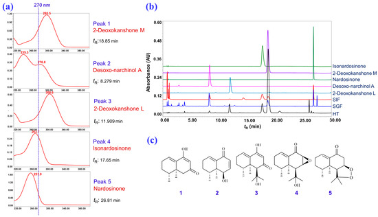 Attribution of the marker compounds. (a) UV absorption curves of the five quantitative marker substances (210–400 nm); (b) stacked UPLC chromatograms of the five quantitative marker substances and incubation products of nardosinone in HT, SGF, and SIF; (c) chemical structures of the five quantitative marker substances.