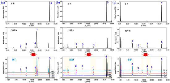 As shown in Figure 8, the UPLC analysis result of the refluxed products of nardosinone in slightly boiling water for 0, 30, 60, and 120 min indicated that nardosinone (5) was rather unstable in hot water and degraded entirely after 2 h of refluxing in boiling water. The main degradation products were 2–deoxokanshone M (1), desoxo-narchinol A (2), 2–deoxokanshone L (3), and isonardosinone (4). Hence, compounds 1–5 were selected as the marker compounds (Figure 9c) for further UPLC profiling of the degradation of nardosinone under a high-temperature (in 50% aqueous methanol at 80 °C, HT) condition and in simulated gastric (SGF) and intestinal (SIF) fluids in vitro. In consideration of the UV absorption wavelengths of the five marker compounds (Figure 9a), a wavelength of 270 nm was chosen. Figure 9b displays the UPLC stacked chromatograms of the five standard solutions and different incubation products of nardosinone in HT, SGF, and SIF conditions for 60, 48, and 12 h, respectively. Moreover, as shown in Figure 10, the influence of incubation time on the incubation products of nardosinone under three different environments (HT, SGF, and SIF) was studied. Notably, the degradation profile of nardosinone incubated in 50% aqueous methanol (80 °C) for 108 h was consistent with that of nardosinone refluxed in boiling water for 2 h, but markedly different from those in SGF and SIF for 108 h. Desoxo-narchinol A (2) and 2–deoxokanshone L (3) were the common degradation products in the HT, SGF, and SIF conditions. Isonardosinone (4) could not be detected in the incubation products of nardosinone in SGF. At the same time, 2–deoxokanshone M (1) could be found in the degradation products of nardosinone incubated in SIF for 12 h, where it then gradually disappeared with the incubation time.