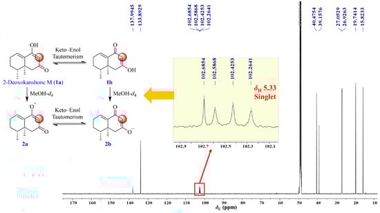 As mentioned above, the production of 2–deoxokanshone M increased and then decreased in 50% MeOH under high temperature, indicating that this product may still be unstable and tended to be further degraded or transformed into other derivatives. Therefore, the preliminary stability test of this compound was undertaken as follows: an accurately weighed amount of 20.0 mg of 2–deoxokanshone M was dissolved in 40 mL of 50% aqueous methanol and SGF–A and then incubated at 80 °C and 37 °C, respectively, for 48 h. Some incubation products with retention times of 25.90 min and 26.32 min were gradually afforded under high temperature in 50% MeOH, while no products were found in the SGF–A incubation (Supplementary Figure S3). Moreover, when 2–deoxokanshone M was subjected to boiling water and refluxed for 2 h without methanol (Supplementary Figure S4a), there was no degradation of transformation undertaken instead. Compared with nardosinone (Figure 8), 2–deoxokanshone M showed significantly high stability in boiling water (Supplementary Figure S4b). Combining the findings mentioned above with the NMR data (Supplementary Figures S5–S7), it could be speculated that the instability of 2–deoxokanshone M in 50% MeOH at high temperature may be attributed to the keto–enol tautomerization and methylation of the enol group due to the presence of MeOH; however, 2–deoxokanshone M seemed to be inert and insensitive to temperature only. Thus, 2–deoxokanshone M (1a) was proposed to be simultaneously transformed into three other products (1b, 2a, and 2b), as deduced by the quadruple δC-8 peaks in the 13C NMR spectrum (Figure 12) of 2–deoxokanshone M in CD3OD. And, two compounds (2a, and 2b) furtherly afforded two methylation products (3a and 3b) when incubated in 50% MeOH at a high temperature of 80 °C for 48 h. The concentration ratio of compounds 1, 2, and 3 was approximately 7:4:1 based on the integral values of δH-8 in the 1H NMR spectrum of 2–deoxokanshone M in CD3OD before and after heating in hot aqueous methanol (Figure 13).