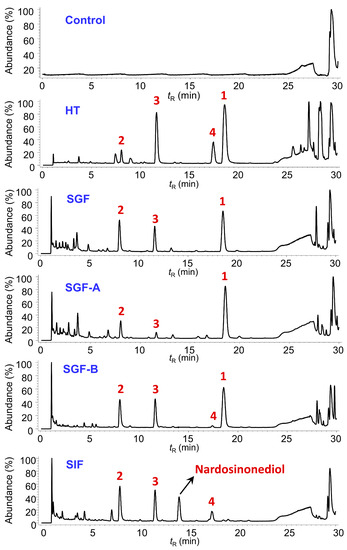 The degradation products of nardosinone in HT, SGF, SIF, SGF–A, and SGF–B were further analyzed using a UHPLC-DAD/Q-TOF MS analysis in the positive mode, with the total ion current (TIC) chromatograms being presented in Figure 14 and the detailed MS information being listed in Supplementary Table S1. Five compounds were identified based on the MS fragments, as presented in Supplementary Figures S10–S14, and the proposed fragmentation pathway was speculated accordingly, as presented in Supplementary Figures S15–S19. It is worth mentioning that nardosinonediol was characterized by UHPLC-DAD/Q-TOF MS through an MS comparison with that of the standard compound. Nardosinonediol was found to be only present in the incubation products of nardosinone in SIF.