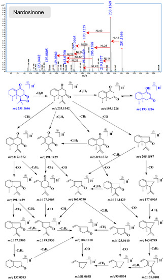 All identified compounds belong to the nardosinane-type sesquiterpenoids; therefore, they share some common ionic fragments in the similar fragmentation pathways. Take nardosinone as an example (Figure 15): A quasi-molecular ion at m/z 251.1646 [M+H]+ has been detected, and it is predisposed to lose an H2O (m/z 18) due to the instability of the peroxy ring, resulting in a characteristic fragment ion at m/z 233.1569. The presence of the carbonyl group in the structure leads to a further loss of the CO group (m/z 28) to afford an ion at m/z 205.1588. More importantly, the inverse Diels–Alder (DA) reaction is readily available for the specialized structure of nardosinane-type sesquiterpenoid, and the ion at m/z 233.1569 could further produce a characteristic fragment ion at m/z 191.1429 in the clue of cleavage of C3H6 (m/z 42). In addition, losses of C3H4 (m/z 40) and CH2 (m/z 14) from the ion at m/z 233.1569 afforded the ions at m/z 219.1377 and m/z 193.1229, respectively. Similarly, a series of ionic fragments were further produced at m/z 177.0905, 163.0750, 149.0960, 135.0805, 123.0442, 109.1010, 95.0854, and 81.0698. Interestingly, keto–enol tautomerization may occur throughout the MS spectrometric cleavage process of a nardosinane-type sesquiterpenoid. Surprisingly, nardosinone and 2–deoxokanshone L could both generate a fragment of 2–deoxokanshone M in their cleavage processes.
