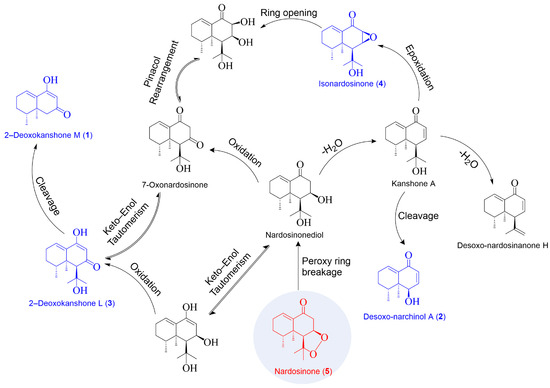 Based on the above-mentioned findings, a plausible degradation mechanism has been proposed, as shown in Figure 16. Initially, the five-membered peroxy ring in nardosinone (5) [8] makes it prone to a ring-opening reaction, which directly converts it to nardosinonediol [8]. Nardosinonediol remains generally stable in a neutral medium and is readily oxygenated to 7–oxonardosinone [8] or dehydrated to form kanshone A [8] in acidic and/or high-temperature conditions. This might be why nardosinonediol cannot be detected in the degradation products of nardosinone in HT and SGF except for in SIF. Kanshone A could undergo an epoxidation reaction to form isonardosinone (4) [8]. The epoxy three-membered ring in isonardosinone (4) is highly unstable in an aqueous acidic solution; it is readily exposed to a ring-opening reaction followed by a pinacol rearrangement and transforms into 7–oxonardosinone. This might explain why isonardosinone (4) cannot be found in the incubation products of nardosinone in SGF and SGF–A. Kanshone A was subject to a dehydration reaction to provide desoxo-nardosinanone H [8] or a cleavage of C3H6 to generate desoxo-narchinol A (2) [8]. 7–Oxonardosinone was susceptible to a keto–enol interconversion to form 2–deoxokanshone L (3) with an unsaturated hydroxyl group, which was followed by a cleavage of C3H6O to afford 2–deoxokanshone M (1). It is noteworthy that all of the compounds mentioned above have been reported to be isolated from the same plant of N. jatamansi except for the novel compounds, namely 2–deoxokanshone M (1) and 2–deoxokanshone L (3).