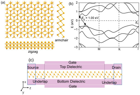 The optimal lattice parameters of ML selenene are a = 3.76 Å, c = 6.52 Å, based on previous theoretical work [19,20]. Lattice structures of ML selenene from both top and side views are presented in Figure 1a. Figure 1b depicts the band structure of ML selenene using a double-zeta polarized (DZP) basis set in QuantumATK, showing an indirect band gap of 1.0 eV and exceeding the expected theoretical value of 0.73 eV (DFT/PBE) by a small amount, which is close to the theoretical value of 1.13 eV (DFT/HSE06) [24,25]. Figure 1c presents the n- and p-doped ML selenene, serving as channels and electrodes for the sub-5-FETs. A UL area was the uncovered part of the channel by the gate electrode, which was added between the source/drain electrode and gate. UL is an effective method to extend the effective channel length [26,27,28]. We executed the test for doping concentration to provide the best possible device performance (Figure S1). According to the test for doping concentration, we found that the off-state current of the 5 nm gate length n-type selenene FETs can not meet Ioff for ITRS HP along the armchair direction, except for doping concentration n = 5 × 1012 cm−2, as shown in Figure S1. Thus, the on-state current of the 5 nm gate length p-type selenene FETs is higher than that of n-type selenene FETs. The slope of transfer characteristics curves of the 5 nm gate length p-type selenene FETs is larger than that of n-type selenene FETs. Therefore, the p-type ML selenene FETs perform better than the n-type ones in the device. As a result, we exclusively investigated p-type ML selenene FETs in the arm- and zig-directions, and we adopted the doping concertation to 5 × 1013 cm−2 in the following calculations.
