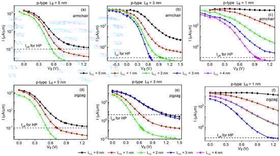 Transfer characteristics of the p-type sub-5 FETs with LUL = 0, 1, 2, 3, and 4 nm (a–c) along the armchair and (d–f) zigzag direction. The bias is 0.64 V. Black dashed lines represent the ITRS HP requirements for the off-state current.
