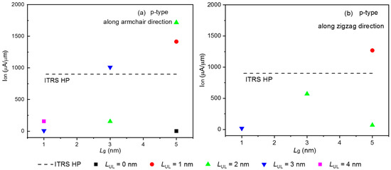 On-state current as a function of the p-type sub-5 FETs with different gate lengths for HP applications along the (a) armchair and (b) zigzag direction.