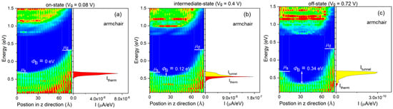 Figure 4 presents spectrum characteristics of the 5 nm Lg p-type selenene FETs (p-type 5 FETs) with LUL = 1 nm in the HP application, allowing us to observe gate modulation along the arm-direction. Examples will be shown to demonstrate the spectrum current and position-resolved local density of states (LDOS) at on-, intermediate-, and off-states. The distance between the source’s Fermi level and the channel’s lowest valence band maximum is known as the hole activation energy (ΦB). As Vg rises from 0.08 to 0.72 V, the channel’s band edge tilts downwards, increasing from 0 to 0.34 eV. Consequently, the total current (Itotal) in the device comprises tunnel and thermal current (Itunnel and Itherm). Figure S2 depicts the 5 FETs with LUL = 1 nm in the zig-direction. The gate modulation mechanism of the p-type 5 FETs with LUL = 1 nm in the zig-direction is similar to that in the arm-direction. The related transmission eigenstates are the transport conditions in the on-, intermediate-, and off-state with E = 0.38 eV. Figure 4 and Figure S2 depict the transmission eigenstates of p-type 5 FETs with LUL = 1 nm at E = −0.38 eV in the on-, intermediate-, and off-state, respectively.