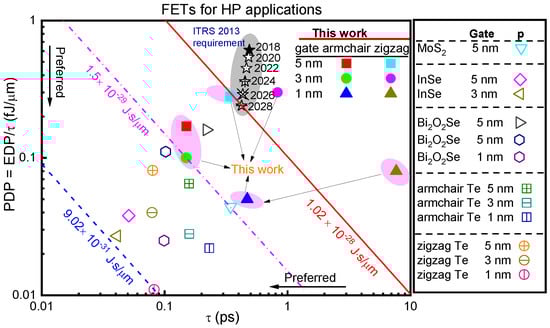 PDP versus τ of ML MoS2 [30], InSe [31], Bi2O2Se [32], and Tellurene FETs (along the arm- and zig-direction) [9] for the HP applications, respectively. Solid lines are the minimum ITRS requirements for the energy–delay product EDP = τ × PDP. Dot and dash dot lines are the minimum EDP value of the p-type sub-5 FETs and ML tellurene FETs reports, respectively.