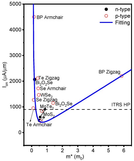 The Ion is a critical figure of merit for the logic transistor, to figure out the key factor that affects Ion, the relationship between the effective mass (m*) and Ion of the suggested model at various 5 nm Lg 2D semiconductors FETs is displayed in Figure 7 [9,30,31,32]. When m* < 0.68 m0, Ion decreases with increasing m*, and Ion is at its lowest when m* ≈ 0.68 m0. For m* > 0.68 m0, Ion increases with increasing m*. Tiny m* results in a higher Ion and greater carrier velocities (v = eEτ/m*), which are determined by the e (charge), E (electric field), and τ, respectively. The current can be written as I = nev, where n is the carrier concentration. The density of states (DOS) of the transport channel is negligibly tiny. DOS is written as , where gs(v) is the spin (valley) degeneracies, is the reduced Plank constant, and is the transverse (transport) effective mass. Larger m* leads to slower velocity, but the DOS of the transport channel is enough; thus, Ion is high. According to Figure 7, the competition between m* and DOS results in a dominant factor affecting Ion. The anisotropy has been found in many 2D materials, such as ML BP [34,35], 2D BiAs [36], ML and BL tellurene [8,9], and ML selinene [19], and so on. The physical properties (elastic modulus, effective mass, deformation potential, and carrier mobility) of ML selenene are different between the arm- and zig-direction. Using the software package QuantumATK 2019, the effective mass (m*) of ML selenene was obtained from the band structure; the hole effective mass of ML selenene is 0.14 m0 and 0.43 m0 along the arm- and zig-direction, respectively. It is consistent with previous reports in the literature [19]. The hole effective mass of ML selenene along the arm-direction is lighter than that of the zig-direction, and the Ion (1717.80 μA/μm) of p-type 5 FETs along the arm-direction is larger than that (1269.00 μA/μm) of the device along the zig-direction, as shown in Table S1. The Ion of ML selenene are different between arm- and zig-direction with 3 nm and 1 nm gate length. Along the arm-direction, the m* (0.14 m0) of the hole for ML selenene is lighter than that (0.39 m0) of the ML tellurene, the Ion (1717.81 μA/μm) of ML selenene is larger than that (951 μA/μm) of ML tellurene. Along the zig-direction, the effective mass (0.43 m0) of ML selenene is larger than that (0.11 m0) of ML tellurene, so the Ion (1269 μA/μm) of ML selenene is smaller than that (2114 μA/μm) of ML tellurene.