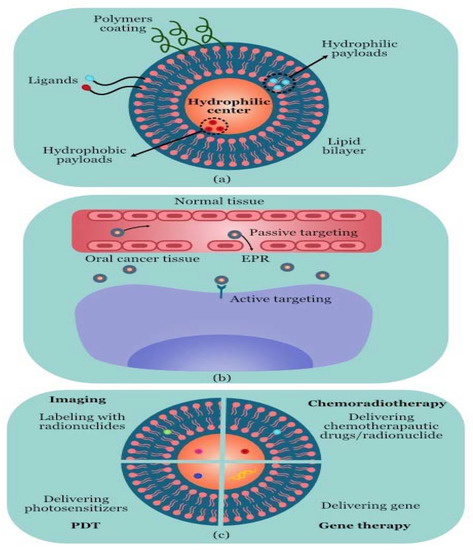 Liposomes are commonly employed in delivery systems for a range of anticancer therapies to increase the efficiency of anticancer drugs and reduce adverse effects. The surfaces of drug-loaded liposomes have been coated with a variety of biocompatible polymers, including polyethylene glycol (PEG), due to the ease with which the reticulo-endothelial system (RES) may remove them. PEG is a man-made hydrophilic polymer that can be crosslinked with the liposome surface to prolong the half-life in the bloodstream and prevent RES removal. Numerous studies have been conducted on formulations created through adding antitumour medications, including doxorubicin, to liposomes. PEGylated liposomal doxorubicin (PLD) has a stronger apoptotic effect on CAL-27 cells than free doxorubicin [110]. Although PLD has a strong safety record, certain patients’ long-term usage of the drug has been linked to the emergence of OSCC or precancer lesions [111,112]. Curcumin, paclitaxel, carboplatin, and cisplatin are other medications included in liposomes and are similarly more effective at inducing the apoptosis of cancer cells [113]. It was discovered that taking two or more anticancer medications with supplements increased the effectiveness of chemotherapy. In the case of OC, the coencapsulated liposomal formulation of doxorubicin (Dox) and resveratrol (Res) has been investigated, and in vitro testing of the medication combination revealed improved efficacy in the treatment of OC [114]. Meanwhile, liposome-based gene therapy formulations have considerable promise for the treatment of OC. A straightforward method of introducing therapeutic genes into target cells, liposomes represent a promising substitute for viral vectors [115,116]. The use of liposomes as radionuclide carriers for tumour radiation has also been investigated. After convection-enhanced administration, 186Re loaded into liposomes can successfully cure OC with few negative effects [117].