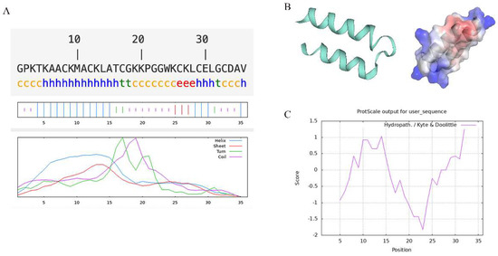 (A) secondary structure prediction. Alpha helix (h), Random coil (c), Extended strand (e), and Beta turn (t); (B) tertiary structure prediction and electrostatic potential analysis (blue area electrostatic potential value is positive and red area electrostatic potential value is negative); and (C) hydrophobicity analysis (hydrophilic regions are represented by negative values and hydrophobic regions are represented by positive values).