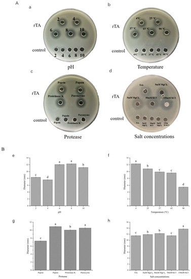 Turgencin A stability study: (A) Inhibition circle pictures corresponding to stability study. Negative control: (a) the buffer solution of different pHs, (b) the 50 mM pH 7.4 Tris-HCl solution treated at different temperatures, (c) the different protease solutions, and (d) the different salt solutions; (B) Histogram of stability study analysis, Y axis: diameter of inhibition circle. (e) Effect of pH on Turgencin A stability; (f) effect of temperature on Turgencin A stability; (g) effect of protease on Turgencin A stability; and (h) effect of salt concentration on Turgencin A stability. The same letters (a–d) indicate no significant difference between groups, and different letters indicate statistically significant differences between groups (p < 0.05) as calculated by one-way ANOVA followed by Tukey’s test.