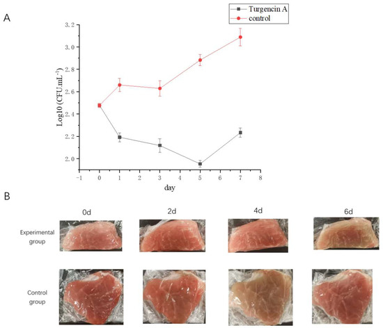 Food corruption is mainly caused by bacterial action, and it is crucial to inhibit foodborne pathogens to extend the shelf life of food. Therefore, an antibacterial ability is one of the most essential characteristics of biological preservatives [38]. As shown in Figure 7A, the bacterial count of the control group showed an increasing trend with a change in pork storage days (0, 1, 3, and 5 days). In contrast, the bacterial colonies of the experimental group (pork treated with rTurgencin A at 10 μg·mL−1) showed a decreasing trend with an increase in days. The comparison between the experimental and control groups showed that the number of colonies in the experimental and control groups was similar on the first day. Still, as the days progressed, there were fewer colonies in the experimental group. The results showed that rTurgencin A inhibited the total food spoilage bacteria in pork and prolonged the storage time of the pork. Further study on its inhibitory effect on single bacteria could improve its application potential in food preservation.