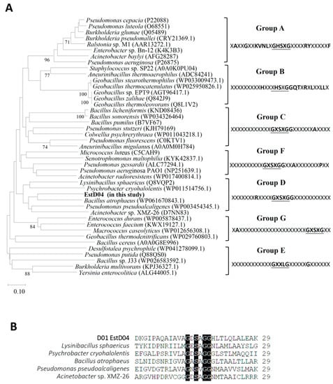 Phylogenetic analysis of the 29 amino acids surrounding the Ser-residue catalytic site of EstD04 esterase and other 42 lipolytic enzymes. (A) GenBank accession numbers for amino-acid sequences are indicated in parentheses. Sequence alignment is performed using Clustal W of MEGA11 software, and the tree is produced by Neighbor-Joining method. Numbers on branches indicate bootstrap value per 1000 replicates. The bar represents the scale of branch length with 0.10 variance in amino-acid sequence. Conserved amino acids surrounding the catalytic site are listed for each group. X represents any residue. (B) Sequence alignment of the 29 amino acids surrounding the catalytic site of group D (bHSL) members.